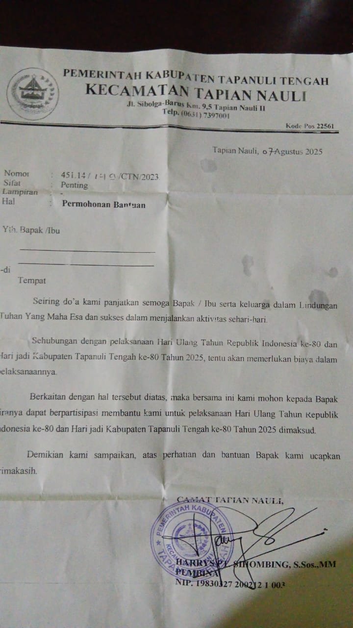 “Sehubungan dengan pelaksanaan Hari Ulang Tahun Republik Indonesia ke-80 dan Hari Jadi Kabupaten Tapanuli Tengah ke-80 tahun 2025, tentu akan memerlukan biaya dalam pelaksanaannya… kami memohon kepada bapak kiranya dapat berpartisipasi membantu kami,” demikian tertulis dalam proposal tersebut.