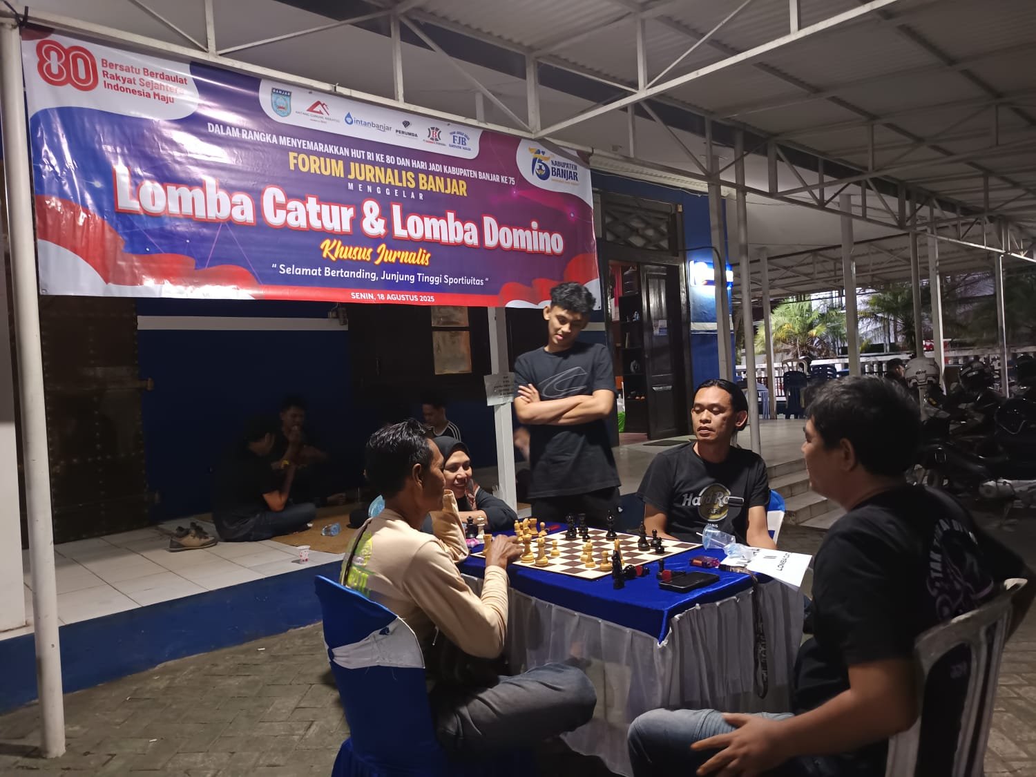 Acara yang digelar di Halaman Media Center Kabupaten Banjar pada Senin, 18 Agustus 2025 tersebut berlangsung penuh semangat dan kebersamaan. Tercatat, sebanyak 28 peserta ikut dalam lomba domino, sementara 20 peserta lainnya beradu strategi di meja catur.