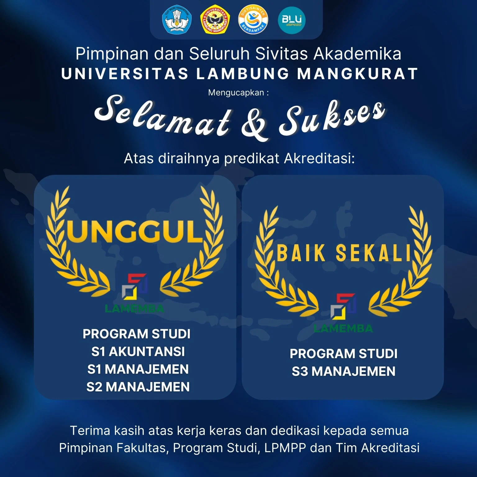 “Alhamdulillah, kita patut bersyukur atas hasil luar biasa ini. Capaian Unggul dan Baik Sekali dari LAMEMBA menjadi bukti bahwa FEB ULM memiliki kualitas akademik, tata kelola, dan mutu lulusan yang diakui secara nasional,” ujar Rektor ULM.